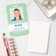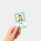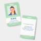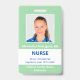 Keep your hospital or medical practice safe with custom photo ID badges featuring your employee's photo, name, job title, and ID number, as well as the business name. You can also include a department if you like. Perfect for a nurse or other staff. On the back you can add more information, such as where to return the badge if it gets lost. Customise it with a photo and custom text in the sidebar. The square photo has a thin white border on a light green background. A white band near the bottom highlights the job title, ID number, and expiration date in blue text. The staff person's name and hospital or business text is white on light green.