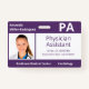 Keep your hospital or medical practice safe with horizontal custom photo ID badges featuring your employee's photo, name, professional job abbreviation, job title, ID number, and business name. You can also include a department if you like. Perfect for a physician assistant, nurse, or other staff. On the back you can add more information, such as where to return the badge if it gets lost. Customise it with a photo and custom text in the sidebar. The square photo on the left has a thin white border surrounded by purple stripes across the top and bottom and thin purple lines by its sides. A white block on the centre right side highlights the job title, ID number, and expiration date in violet text. The staff person's name, job acronym, and hospital or business text is white on purple.