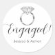 These custom stickers say Engaged! along with a silver banded white diamond engagement ring and the bride and grooms names on the bottom. Perfect for an engagement party or save the date announcement!