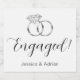 These custom sparkling wine labels say Engaged! along with a pair of silver banded white diamond engagement rings, and the bride and grooms names. Perfect for an engagement party!
