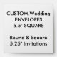 Custom Square Envelopes, 5.5" square envelope for 5.25" square & round invitations. LINEN: elegant paper with a beautiful textural surface of embossed laid lines. 115lb text weight. Formal, evoking mould-made letterpress papers.