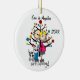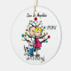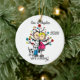 A cute, fun ceramic ornament featuring a stick figure expectant couple, a dog, holiday tree, and text that reads "We're Expecting!" with an area you can add your names or surname and the add the current year!
