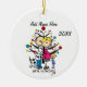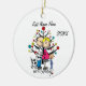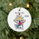 A cute, fun ceramic ornament featuring a stick figure expectant couple, a toddler boy, a dog, holiday tree, and text that reads "We're Expecting!" with an area you can add your names or surname and the add the current year!