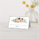 Folded style escort place cards feature a fall floral watercolor arrangement in shades of peach, golden yellow, blue and burgundy with greenery accents.
