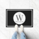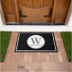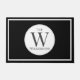 This sophisticated and stylish doormat features a black coloured background. A pale grey frame borders the doormat and a matching circular frame is placed in the centre. Inside the circle is a large Initial to represent the first letter of the family name printed in a dark grey. A sample family name is printed below the initial.