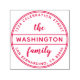 Easily personalise these custom Custom Family Name Round Return Address self-inking rubber stamps with your own names and address. To customise these rubber stamps, click on "Personalise this template" and change the text in the boxes provided. Available in 9 different colours and 6 sizes. Please view your design on the monitor as close to actual size as possible to ensure that the text prints at the expected size. For use as a return address stamp most people will require a larger size. These return address self-inking rubber stamps stamp up to 10000 impressions with each cartridge, have a soft touch for secure grip and ink-free fingers and an eco-friendly manufacturing process. No minimum order quantity.