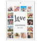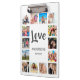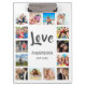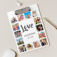 Create your own personalised 14 photo collage, clipboard with your custom images on a simple modern white background. The clipboard face also features your family name, established year and a "Love" handwritten script. Add your favourite photos, designs or artworks to create something really unique.