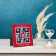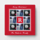Custom family pictures Christmas photo collage display plaque. Custom picture stand with easel. Personalizable with your own winter Holiday photographs. Great for family images, portrets, vacation memories, wedding day, honeymoon etc. Template design with stylish script typography, fancy border and monogram initial letter. Cute gift idea for friends, family, mum and dad, newlyweds / bride and groom couple etc. Upload your own xmas designs. Also nice for on desk of business employees / company office team. Trendy table decorations and accessories. Red or custom colour background.