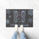 Custom house doormat with a design featuring Santa's boots footprints with faux iridescent colours, snowflakes, and a family name, Holiday message, or any personalised text you'd like to add.