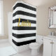 Personalise the faux gold script on this black-and-white striped shower curtain with your desired text.