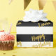 Personalise your faux (not foil) gold script on a black and white striped pattern background. Display text, 'Happy Birthday Laura', can be changed to your desired message such as congratulations or thank you with the recipient's name.