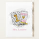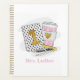 This first grade teacher personalised planner will keep lesson plans in one place. Pattern has white with black polka dot notebook with a gold one, heart coffee, ruler, pen and pencil. This white with black polka dot notebook design can be found on other items in my shop, PageCreativeDesigns.