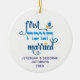 Cute FIRST HANUKKAH MARRIED ceramic ornament with CUSTOMIZABLE NAMES & YEAR. Hanukkah is written in Hebrew. Design shows Hanukkah blue handwriting script typography with blue and yellow dreidel. A beautiful souvenir for couples celebrating their first married Hanukkah. Design is repeated on the back. English version available separately. Also in blue.