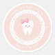 Personalised First Tooth party decorations. Peach pink sticker with cute baby tooth, editable name and milestone date. Visit the shop to see all the First Tooth collection.