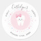 Personalised First Tooth party decorations. Peach pink sticker with cute baby tooth, editable name and milestone date. Visit the shop to see all the First Tooth collection.