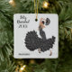 at christmass as a hanging decration for the chritmass tree.. its white porcline or cramic but very well made with added photo on one side.. also has a lovley red bag to keep it in.. execlent printed text in bold and black stands out well aganst the blue background of the photo.