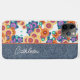 Contemporary bright purple, blue, green, pink, orange, and red floral pattern on a faux blue jeans denim background. With room to customise or personalise with a name, monogram, or initials of your choice. Beautiful, modern, and cool cover for the trend-savvy and art-loving hip trendsetter, artsy motif lover who wants to protect their phone from dust and dirt, wear and tear. This design is available in Apple iPhone 6, 7, and 8 Plus, 10 or X, XR, XS, 11, 12, 13 Mini, 14, 15 Plus, and Pro Max cellphone cases. Show off your style, look fashionable trendy, and feel stylish with a unique design on a mobile device accessory of your choice.