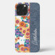 Contemporary bright purple, blue, green, pink, orange, and red floral pattern on a faux blue jeans denim background. With room to customise or personalise with a name, monogram, or initials of your choice. Beautiful, modern, and cool cover for the trend-savvy and art-loving hip trendsetter, artsy motif lover who wants to protect their phone from dust and dirt, wear and tear. This design is available in Apple iPhone 6, 7, and 8 Plus, 10 or X, XR, XS, 11, 12, 13 Mini, 14, 15 Plus, and Pro Max cellphone cases. Show off your style, look fashionable trendy, and feel stylish with a unique design on a mobile device accessory of your choice.
