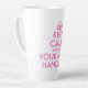 Make your own funny keep calm and let handle it latte mug. Custom coffee cup with vintage keep calm and carry on typography template including a pink crown. Fun drinkware for home or office. Create humorous Birthday presents for mom, dad, father, grandpa, husband, wife, bride, wedding planner, co worker, colleague, teacher, coach, friends, manager, employees, family, business boss, Trump fan etc. Cone shaped glass printed on both sides. Available in 12oz and extra large 17oz size. Big drinking mugs with large print area. Office humor gift ideas.