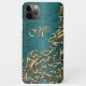Contemporary and classy chic decorative glamourous shiny yellow gold metallic looking romantic vintage damask paisley flowers vine pattern on a dark teal blue green faux metal background. With room to customise or personalise with a monogram of your choice. Beautiful, modern, and cool cover for the trend-savvy and art-loving hip trendsetter, artsy motif lover who wants to protect their phone from dust and dirt, wear and tear. This design is available in Apple iPhone 6, 7, and 8 Plus, 10 or X, XR, XS, 11, 12, 13 Mini, 14, 15 Plus, and Pro Max cellphone cases. Show off your style, look fashionable trendy, and feel stylish with a unique design on a mobile device accessory of your choice.