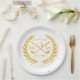 Custom gold golf club paper plates in elegant, modern, minimalist, chic design. Personalised golf club paper plates with laurel wreath, two crossed golf clubs, and golf ball. Personalised golf driver head cover with your logo, name, text, year, etc. Elegant gold golf club paper plates personalised gift for golf club, golfer, golf player, team, coach. Black and White and Gold custom personalised golf club paper plates