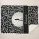Your favourite golfer will love this design created especially for her. Female golfer silhouette is positioned on a realistic image of a golf ball. A coordinating ribbon completed in trendy sophisticated black is positioned slightly below the golfer and is the template for custom name or text in white script calligraphy. The background is chic black and features a contemporary pattern of swirls and leaves in coordinating popular ultimate grey. ALL colours in this design may be customised!