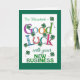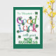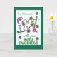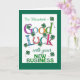 A Good Luck with your New Business greeting card to personalise, with brightly coloured lettering, four-leaf clovers and a horseshoe for luck! A text-based,