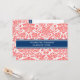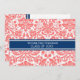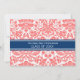 Graduation party invitation custom card in elegant and sophisticated peach orange pink, dark navy blue and white classic vintage floral damask pattern. Customise this grad announcement card by adding the year of your graduation and your graduation party details.
