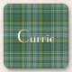 Great looking traditional green, yellow, black, and white Clan Currie tartan plaid coaster, with white custom text ready to personalise. This pretty cork back coaster is a lovely addition to any table. Makes a great gift idea.