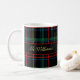Personalise this handsome and beautifully lettered coffee mug. The design field is black, dark green Scottish tartan plaid, with red, blue and yellow accents. The lettering is a lovely easy-to-read script in yellow against a black band around the midline of cup. Put the name or initials of your choice on both sides of cup with Zazzle's editing tool. In the centre of the lettering field. between the lettering templates is a lovely script-style decoration.