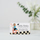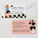 Super cute business cards with retro style housewife wearing an apron, blue dress and oven mitt, sitting on her stove, happy to be cooking or baking, perfect for cooking or baking classes, culinary instruction or a personal chef biz. You can change the background colours, hair colour, apron & mitt, and oven colours.