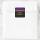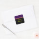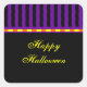 A custom sticker with Happy Halloween in custom messy script letters. The background has orange and yellow stripes on a black and purple striped background. Click Customise It to change fonts, sizing and more.