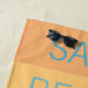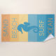 Happy bright coloured beach towel with pastel, pale and soft yellow orange, light and medium sky, azure and ocean blue coloured stripes pattern, with a cute seahorse silhouette and fun SAND BEACH SURF OCEAN quote text. Celebrate summer time... beach time, pool time, fun time!