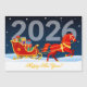 A red fiery horse pulls a sleigh loaded with New Year's gifts against the backdrop of a dark blue starry sky and the numbers 2026. Personalised text Happy New Year!