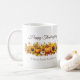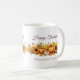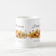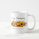 Drinking pumpkin spice latte will taste so much better out of a personalised fall mug. This old fashioned Thanksgiving family reunion gift features a cute vintage drawing of orange pumpkins, fall leaves, and cute autumn sunflowers. Nostalgic Happy Thanksgiving mug with brown script of your family or business name or other personalised text.