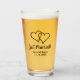 Custom double heart drinking glasses for wedding party, engagement, bridal shower, bachelorete party, bachelor party or anniversary. Romantic party favour for married couple, bride and groom, husband and wife, newly weds, friends, family etc. Personalised love presents for him and her. Interlocking heart symbol design with stylish brush script typography template. Elegant design glasses for drinks like beer, cocktails and more. Unique gift ideas for just married couples and guests. Also available as shot glass. Add your own logo optionally and order in bulk. Upload your image to this template and edit the text. Add names and date of marriage plus quote.