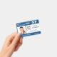 Keep your hospital or medical practice safe with horizontal custom photo ID badges featuring your employee's photo, name, professional job abbreviation and job title, ID number, business logo and name. You can also include a department if you like. Perfect for nurses and other staff. On the back you can add more information, such as where to return the badge if it gets lost. Customise it with a photo, any shape logo, and custom text in the sidebar. The square photo on the left has a thin white border surrounded by blue stripes across the top and bottom and thin blue lines by its sides. A white block on the centre right side highlights the logo, job title, ID number, and expiration date in dark blue text. The staff person's name, job initials, and hospital or business text is white on blue.