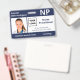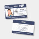 Keep your hospital or medical practice safe with horizontal custom photo ID badges featuring your employee's photo, name, professional job abbreviation and job title, ID number, business logo and name. You can also include a department if you like. Perfect for nurses and other staff. On the back you can add more information, such as where to return the badge if it gets lost. Customise it with a photo, any shape logo, and custom text in the sidebar. The square photo on the left has a thin white border surrounded by navy blue stripes across the top and bottom and thin navy lines by its sides. A white block on the centre right side highlights the logo, job title, ID number, and expiration date in dark blue text. The staff person's name, job initials, and hospital or business text is white on dark blue.