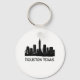 A minimalist and stylish black and white illustration of the Houston skyline, featuring several tall skyscrapers and a silhouette of a park below. The overall composition is clean and modern, with a focus on the iconic architecture of the city.