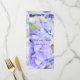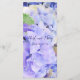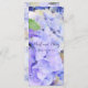 An elegant watercolor image of hydrangea flowers in soft tones of pastel blue and lilac is printed on the custom wedding or event menu. There is a template area you can personalise with your names and date on one side and your menu on the other side.