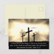 Decorate your space with uplifting words with this custom text Easter postcard. This design has the Bible verse John 16:33 in white script on a black background. The design shows three crucifixion crosses on a hill at sunset. The partially cloudy sky is brightened by sun rays and light coming out of the heavens. The verse reads "I have told you these things, so that in me you may have peace. In this world you will have trouble. But take heart! I have overcome the world." This postcard is fully customisable. Just hit the Personalise button to edit or delete the text, or the Customise button to change the reverse side colour, font colour, or font if you wish. Makes a great inspirational note or decoration. Great for lovers of God, Jesus, Christian faith, spirituality, Easter, Resurrection, and hope giving and inspirational verses from the Bible.