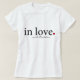 Simple, modern t-shirt design with quote: "in love" written with modern black font type and a tiny red heart.