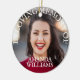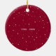 A simpathy holiday ceramic ornament with custom photo, name, date of birth and funeral/death and a personalised round elegant text featuring "in loving memory of", featuring a modern snowfall into a dark burgundy red background. Square and circle shapes. No minumum order.