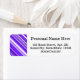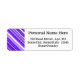 This return address label design features a striped pattern with lines coloured various shades of purple or white. It also features a customisable person, family or business name, above a customisable mailing address.