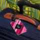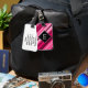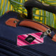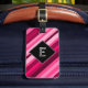 This luggage tag design features a striped pattern featuring various shades of colours like pink and magenta. It also features a customised initial letter in a funky font on the front, and personalised contact details on the back.