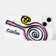 Custom iPhone 14 case design for tennis players. Personalised phone cover with artistic design of pink tennis racket and yellow tennis ball. Add your own name, quote or monogram letters. Sports art drawing of tennis racquet. Customisable Birthday presents for sporty men women and kids. Elegant gift idea for player, fan and coach. Stylish brush script typography. Create one for mum, sister, daughter, friend, team mate, doubles partner, trainer, teacher, grandma, cousin, girl etc. S8 S7 accessories for her.