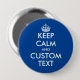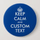 Custom Keep calm huge round blue pinback buttons. Create your own funny Keep calm and carry on parody. Big size pin with modern typography and crown. Customisable template design. All colours can be changed. Fun for Birthday party, event, business, wedding etc. Office humour gift idea.