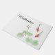 A white doormat featuring an idyllic Zen watercolor painting of two koi in a koi pond with white water lilies and water lily pads, with the customisable word "Welcome" on the left.