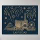This art illustrates the Las Vegas Strip skyline in a refined gold line art style, set against a deep navy background with bright fireworks celebrating the city’s nightlife and entertainment. Iconic landmarks such as the Luxor Pyramid, Paris Las Vegas Eiffel Tower replica, Mandalay Bay resort, and the High Roller Ferris Wheel are all represented with detailed architectural outlines.