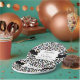 Chic, modern, pretty wild animal big cats leopard print paper plates in black and white with splashes of melon, yellow, pink, blue, green, and lavender with a black stripe and white edged with black banner that you can personalise with the wedding couple's names and wedding date!
